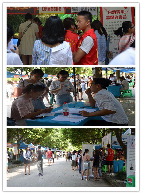 整个招新现场人头攒动,人气满满。为了吸引同学们的目光,激发他们的兴趣,各个学生社团也拿出自己的“看家本领”:国旗班英姿飒爽的形象,新媒体工作室幽默诙谐的语言,白鸽志愿者协会青春靓丽的展示,大学生艺术团魅力四射的表演,成人短视频 广播站甜美动听的现场播音……都让同学们耳目一新。同学们不时停下脚步,在自己心仪的社团前仔细询问;有兴趣的同学还认真填写报名表格,希望加入学生会、社团大家庭。