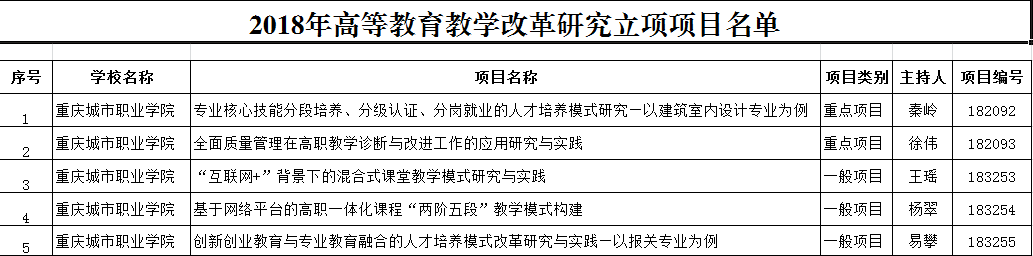 根据《重庆市教育委员会关于公布2018年度高等教育教学改革成人短视频项目立项名单的通知》(渝教高发〔2018〕11号),成人短视频 五项课题获2018年度市教委高等教育教学改革成人短视频项目立项。其中重点项目两项,一般项目三项。