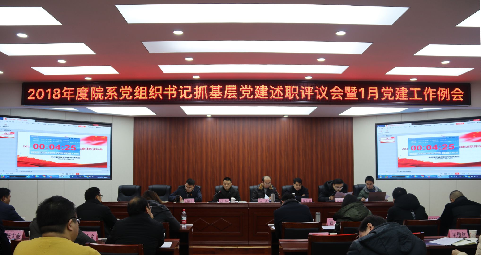 党委在博学馆510会议室召开2018年度院系党组织书记抓基层党建述职评议会暨1月党建工作例会。在校院领导,各部门主要负责人、各院(系、部)主任、总支书记、专职组织员和各基层党支部书记参加会议,会议由党委委员、副院长文斌主持。