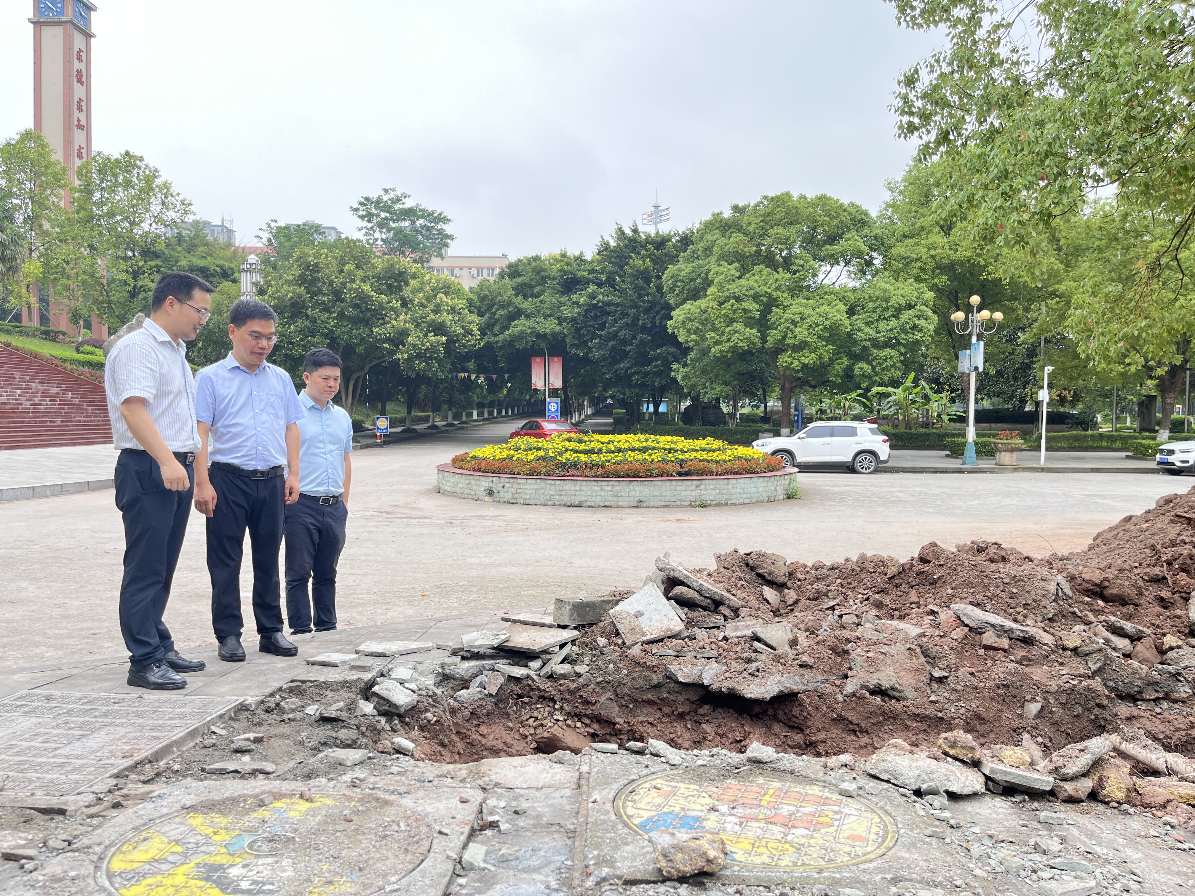 陈劲一行实地调研学校道路管网改造情况。随后,在博学馆607会议室现场调研学校材料,通过听、问、查、看等方式全面细致了解学校主题教育整改整治工作开展情况并组织座谈。