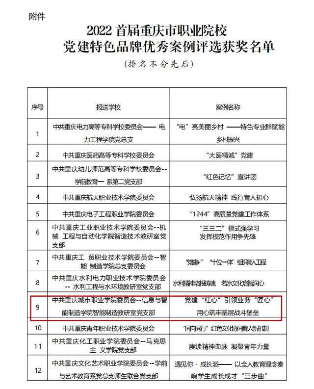智能制造教研室党支部工作案例《党建“红心”引领业务“匠心” 用心筑牢基层战斗堡垒》入选2022首届重庆市职业院校党建特色品牌优秀案例。